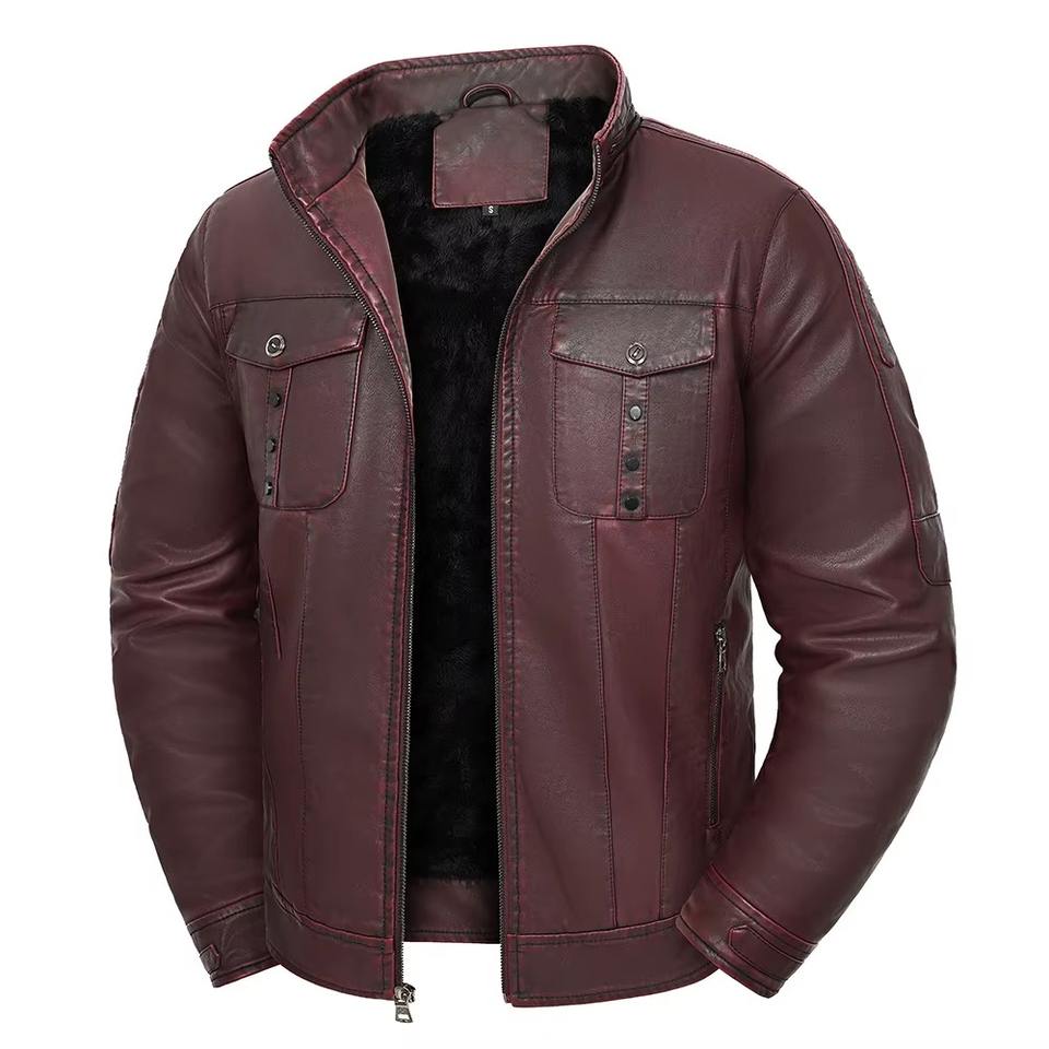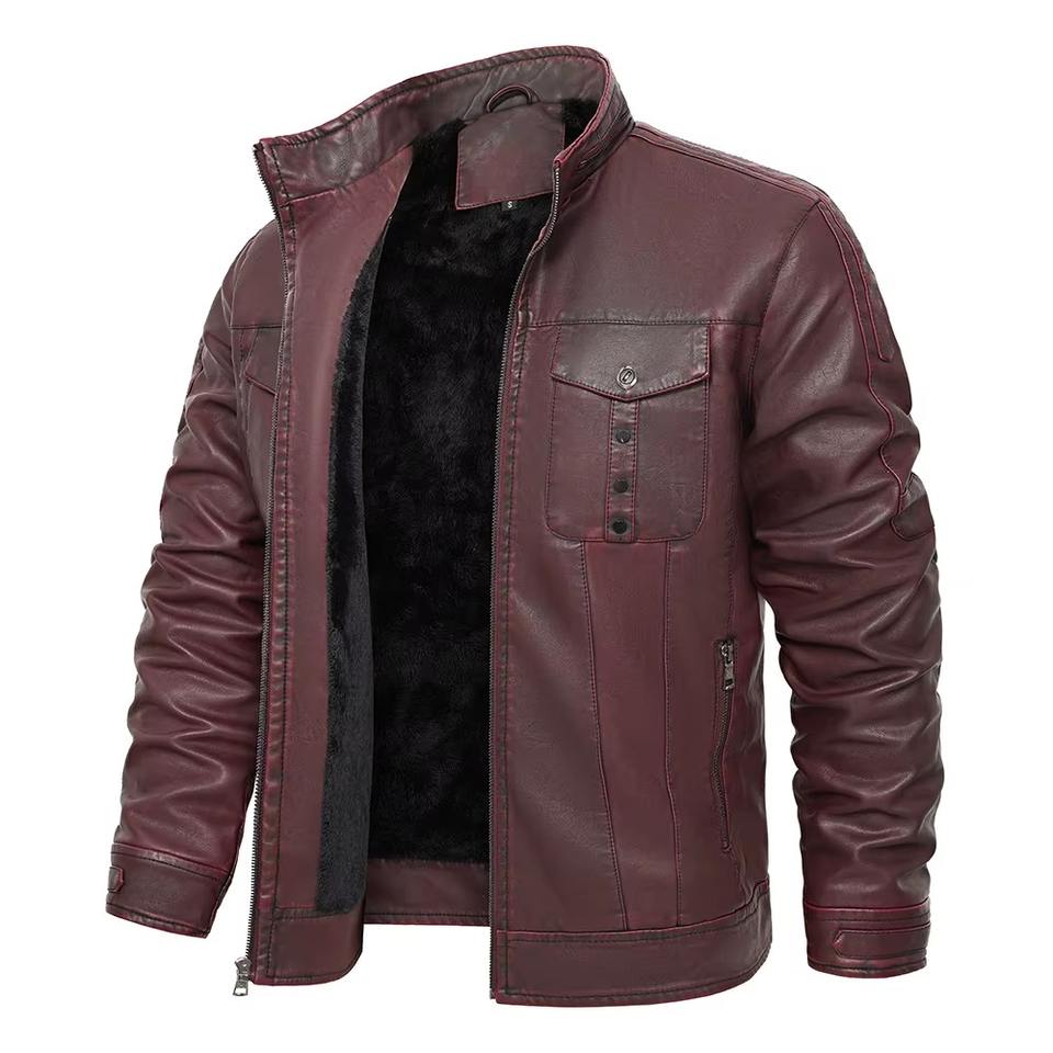 Veste en cuir pour homme, automne, style américain rétro, col montant, doublure en peluche, manches longues, poche zippée, coupe-vent, capuche avant