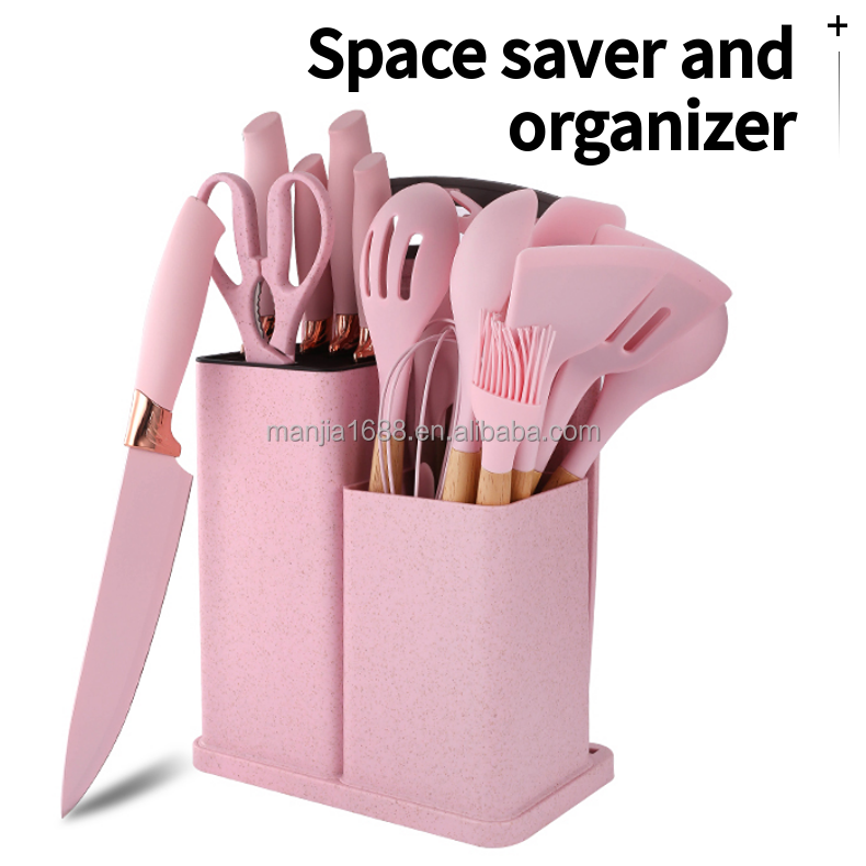 Manjia, Ensemble de 19 Ustensiles de Cuisine en Silicone avec Poignée en Bois et Support de Rangement Compact