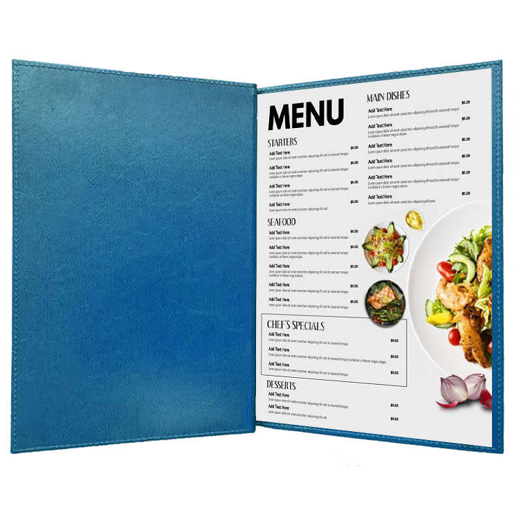 Menu de cocktails du fabricant avec points de fixation extérieurs, menus en similicuir bleu, livre de menus de restaurant