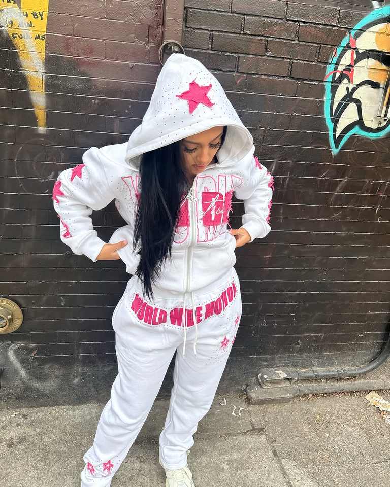 Fabricant Personnalisé Détresse Patch Strass Survêtement 2pc Pantalon de Survêtement Évasé et Sweat à Capuche Lavage à l'Acide 2 Pièces Ensemble pour Femmes