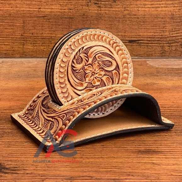 Hand Tooled Leather Coasters With Stand Coaster Set