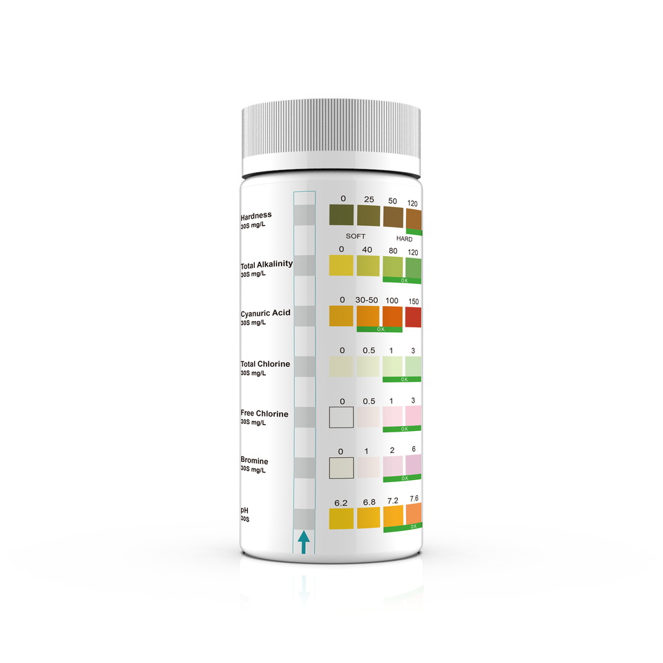 Paramètres:Dureté, chlore, brome, chlore total, acide cyanurique, alcalinité, pH