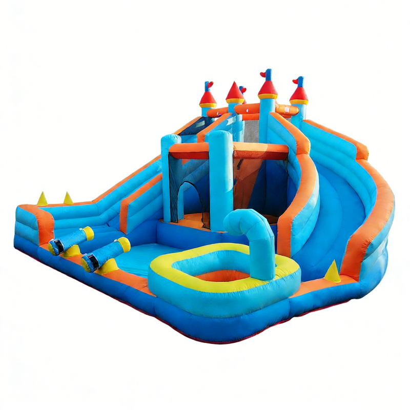 Combo gonflable géant bleu et orange avec double toboggan et piscine à balles, directement du fabricant, durable et sûr