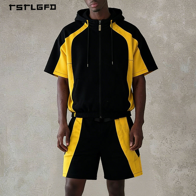 Ensemble court en nylon color-block pour homme, personnalisable avec logo, en tissu imperméable et coupe-vent deux pièces de haute qualité