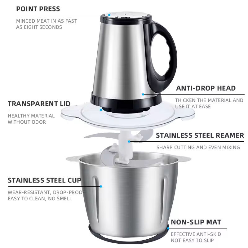Hachoir Électrique Multifonctionnel en Acier Inoxydable pour Viande et Légumes, Capacités 2L, 3L, 5L – Idéal pour la Cuisine et la Maison