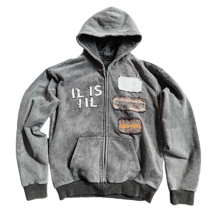 Fabricants OEM Sweat à capuche zippé pour homme, hiver, effet vieilli, brodé, délavé à l'acide, respirant, personnalisé, poids lourd, 100% coton éponge