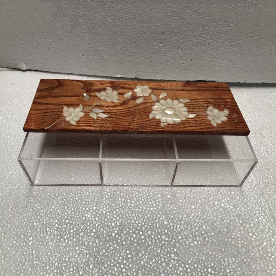 Boîte cadeau carrée de luxe pour l'Aïd avec finition laquée Couvercle en acrylique et bois Incrustation de perles Préservation de la fraîcheur pour les chocolats et les dattes