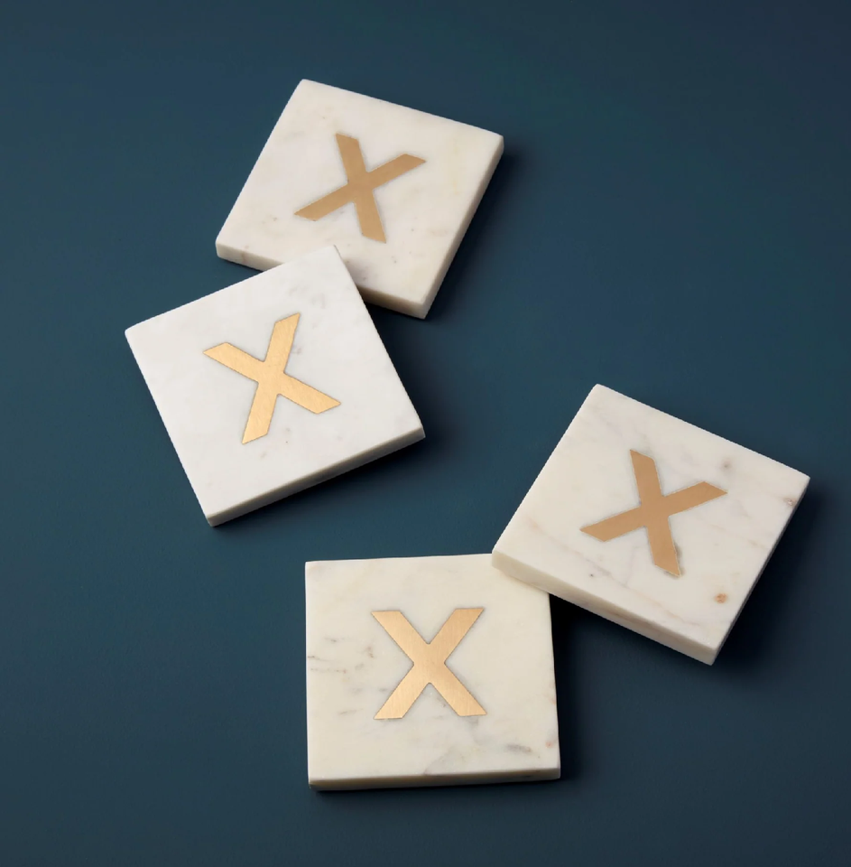 Dessous de verre en marbre Tapis de sol Design unique Tasse à thé Dessous de verre Ensemble de 4 pièces Laiton X Alphabet Design Dessous de verre carrés