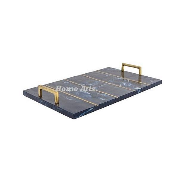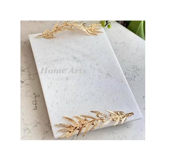 Le plus nouveau plateau de service de nourriture de marbre de conception avec des poignées de feuille en métal le plateau de service de nourriture de forme rectangulaire de la plus haute qualité
