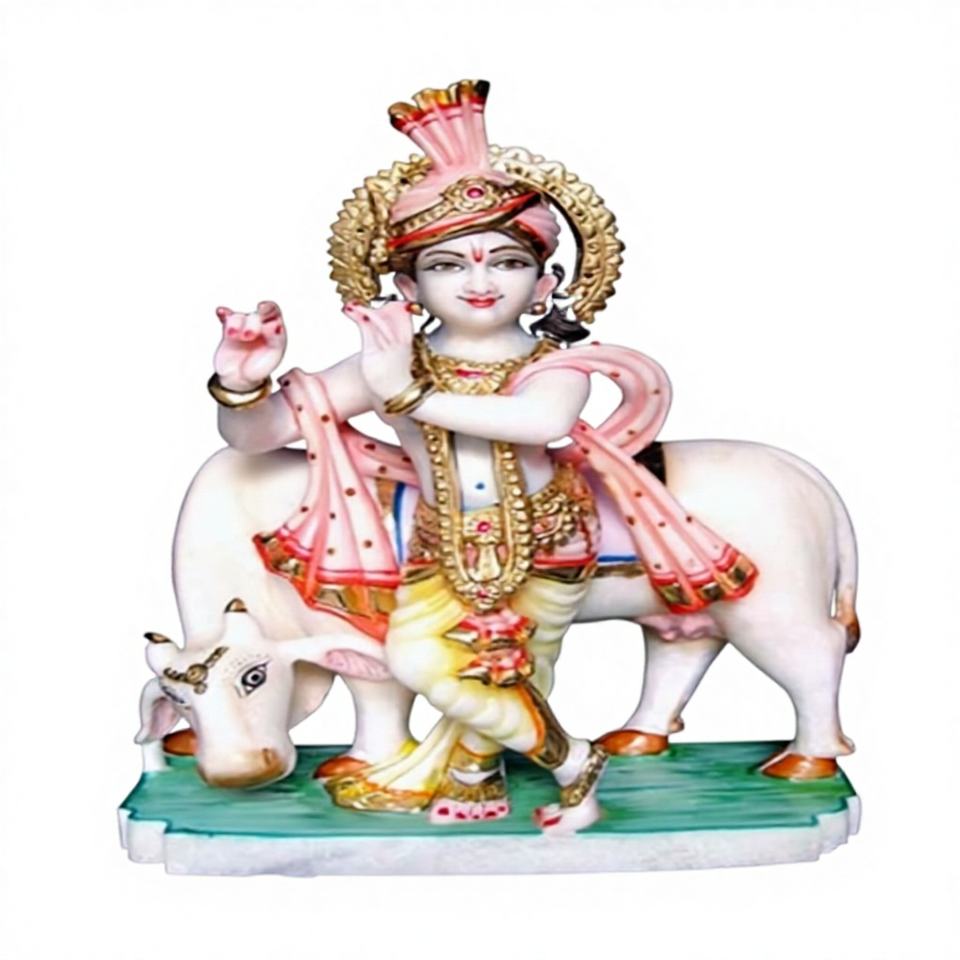 Statue de Krishna en marbre poli avec vache - Sculpture religieuse hindoue pour le culte