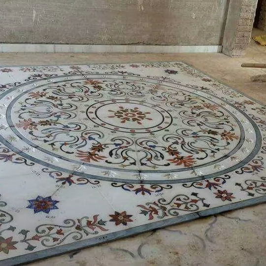 Revêtement de sol en marbre pour temple, motif floral rond avec bordure, dalle de marbre incrustée pour le sol des temples et des maisons