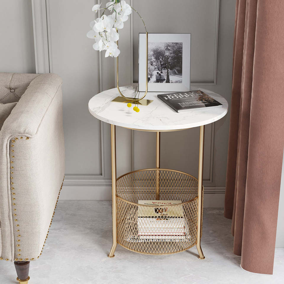 Table basse pliable décorative avec plateau en marbre, cadre en métal doré, panier de rangement, support pour plantes, salon, canapé, meubles de maison, intérieur