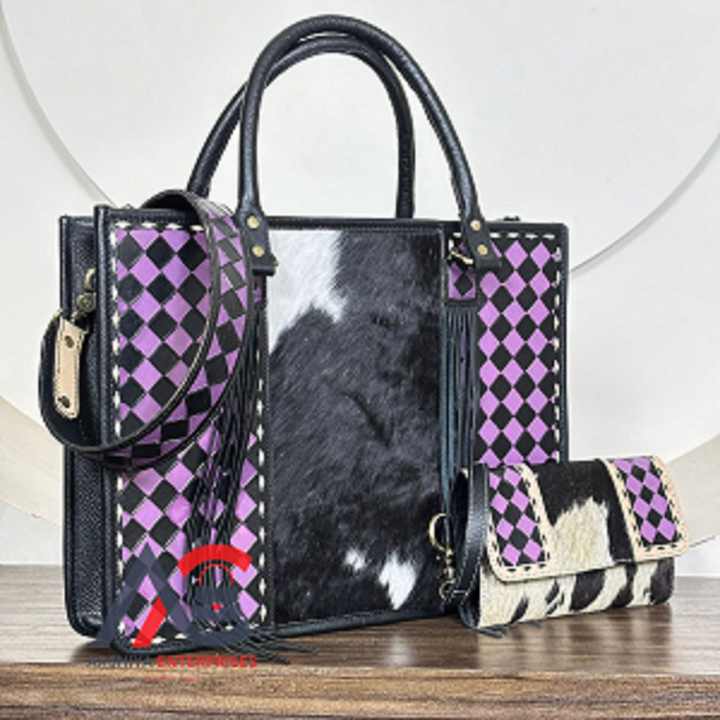 March Expo Ensemble 2 pièces assorti : Sac cabas en cuir à carreaux grande capacité et Pochette à poignet en cuir de vachette travaillé à la main