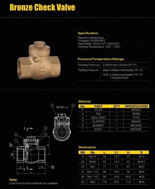 Clapet anti-retour horizontal en bronze à sens unique fileté Marine DN20 pour l'alimentation en eau