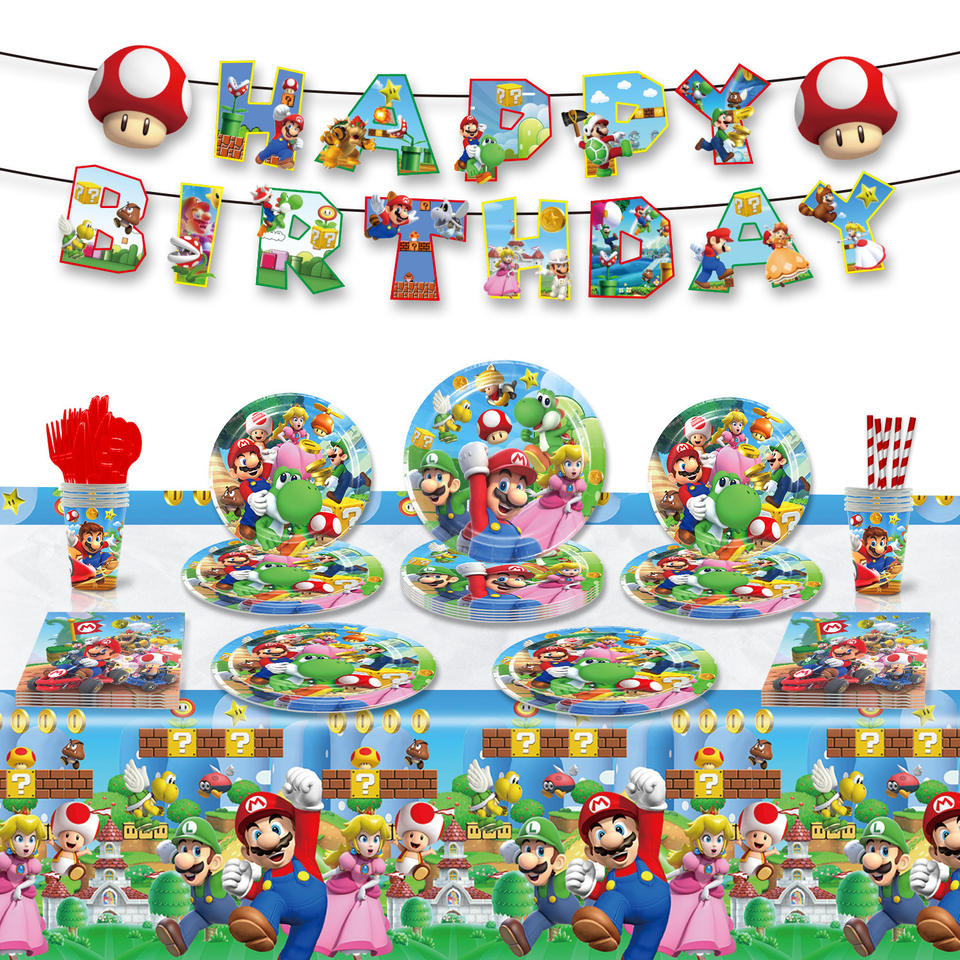 Vaisselle de fête d'anniversaire Mario thème dessin animé nouveau pour Amazon plateau en papier tasse drapeau décoration Arrangement fournitures