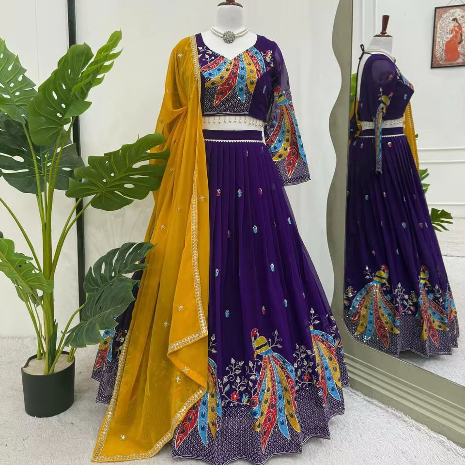 Fonction de mariage spécial lourd Faux Georgette tissu Bollywood Style Lehengas mis en évidence par des accents de miroir/broderie zari