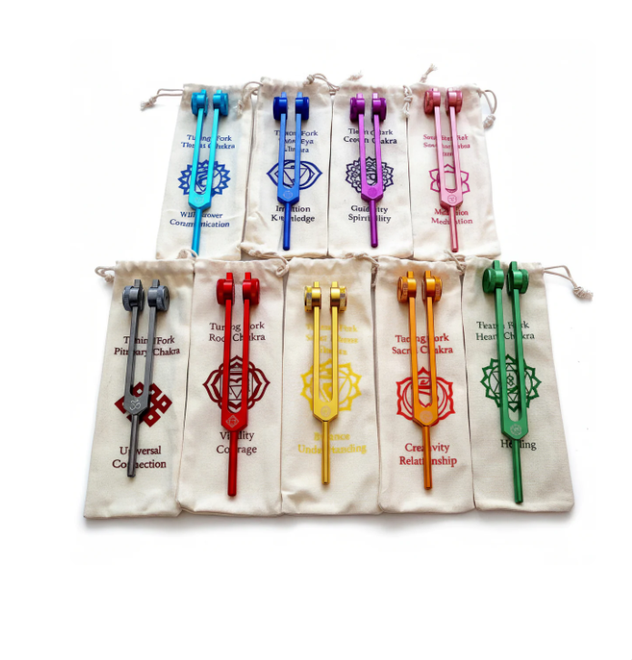 Ensemble de 7 diapasons chakra Mars Manufacture pour l'alignement et la thérapie sonore.
