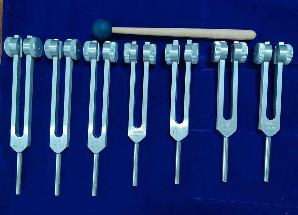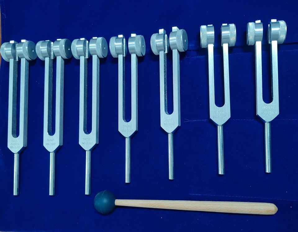 Mars NOUVEAU Kit de 4 Diapasons Argentés 100 200 50 25 Hz pour Guérison, dans un Sac en Velours Rouge de 3 Pieds