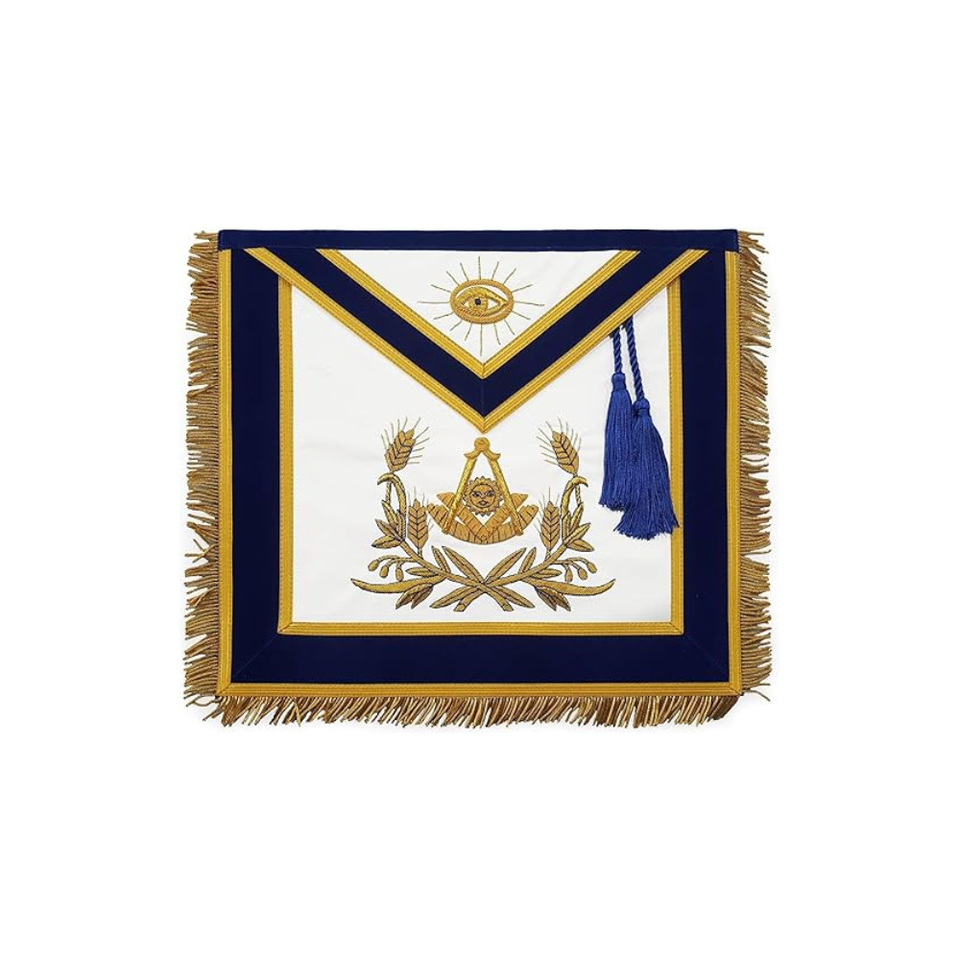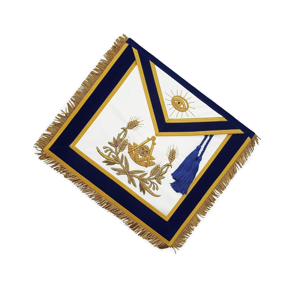 Tablier maçonnique passé maître avec cordons (agneau) or brodé sur tablier maçonnique bleu