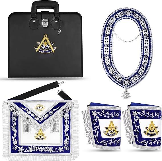 Tablier de Maître Ancien Maçon en Cuir d'Agneau Premium Brodé à la Main, Collier à Chaîne avec Bijou, Manchettes et Étui en Cuir - Officiel