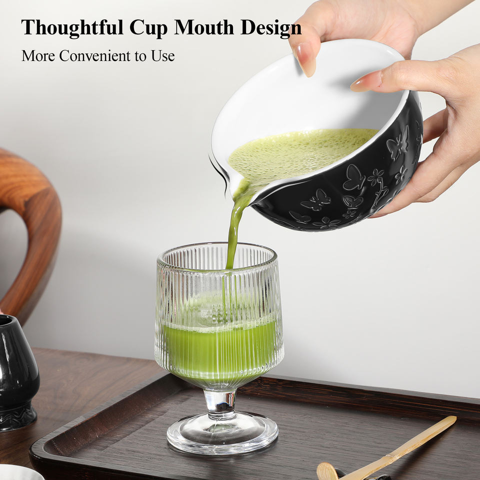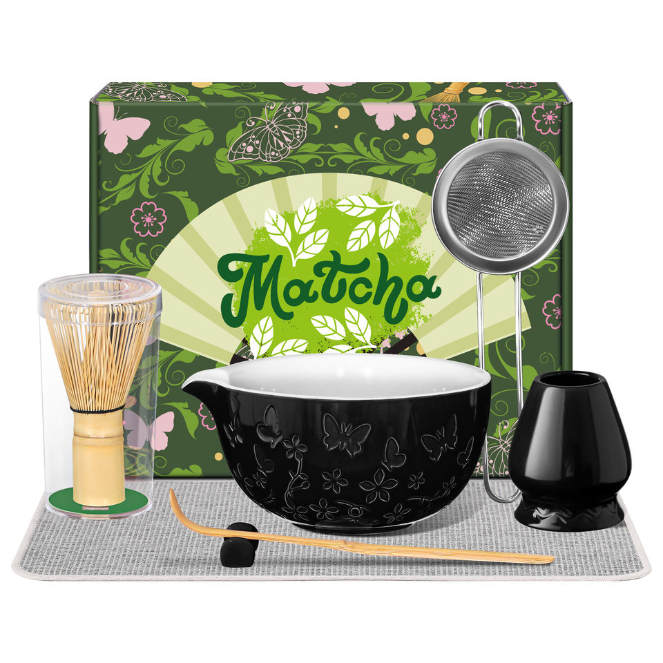 Ensemble de matcha traditionnel japonais - Ensemble de thé matcha 7 pièces - Bol gravé - Fouet à main en bambou - Motif papillon - Céramique matcha