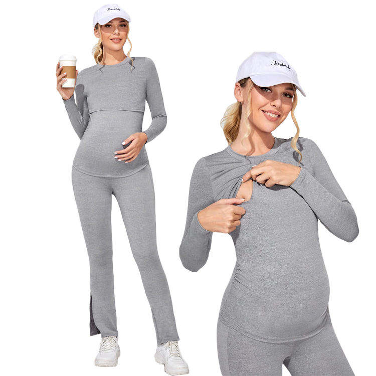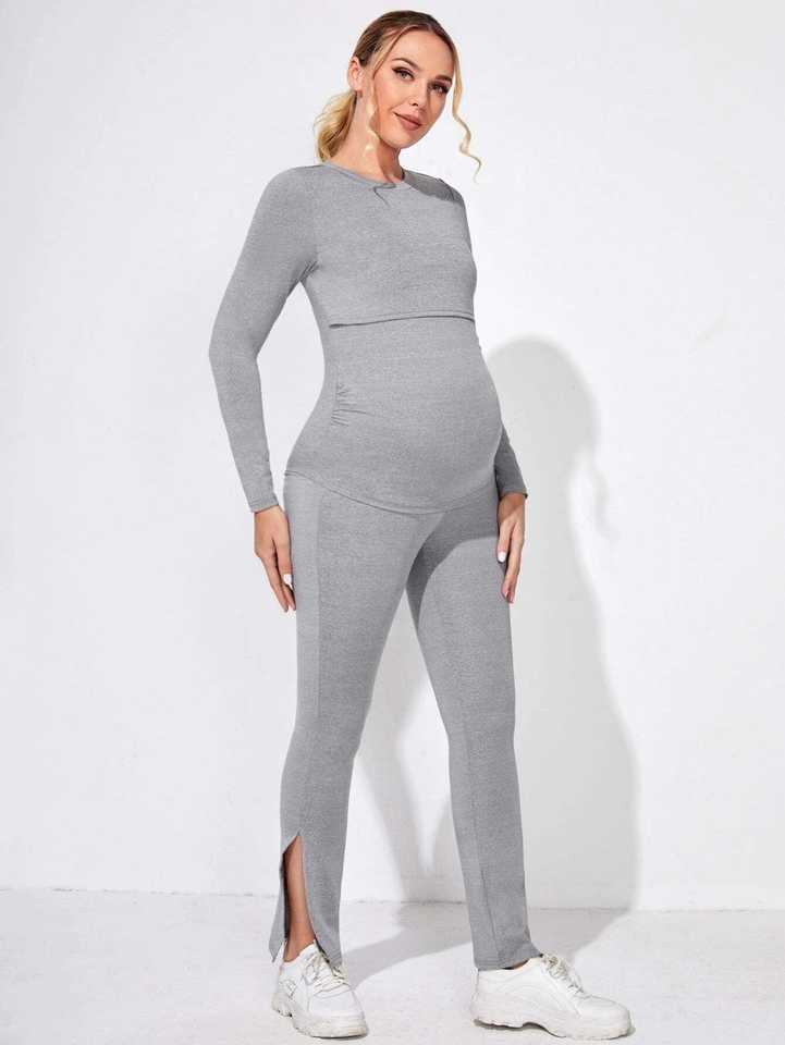 Vêtements de maternité personnalisés : Haut d'allaitement froncé sur le côté et leggings à fente latérale, pyjamas d'allaitement pour femmes enceintes