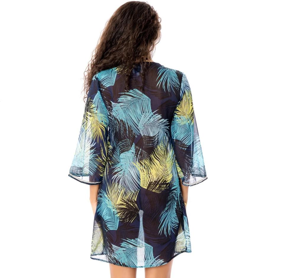 Tunique de plage courte à col V profond de maternité, belle impression translucide aux couleurs vives, une pièce brodée à la main, quatre manches