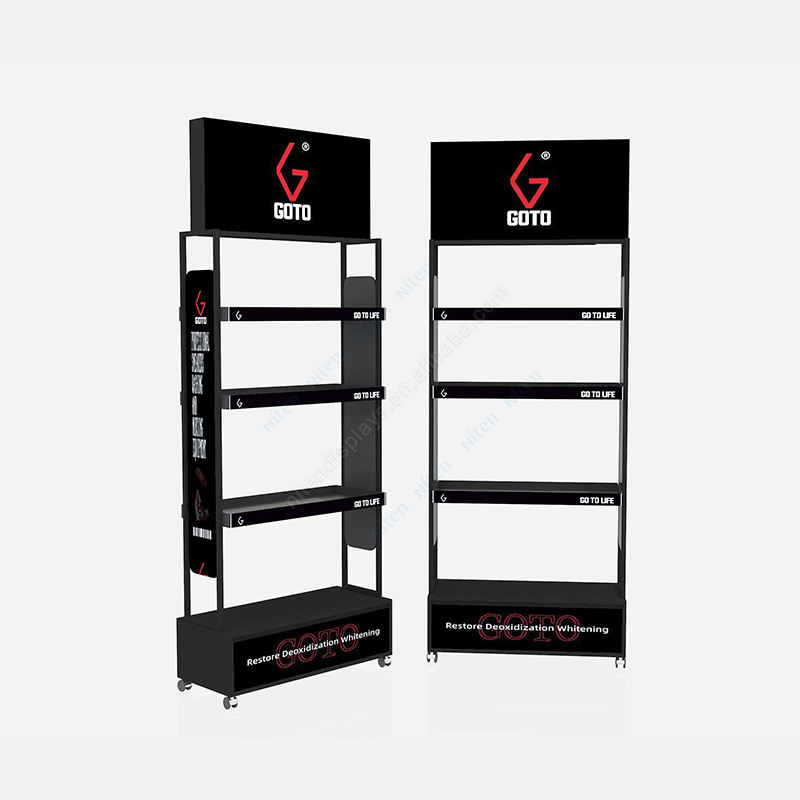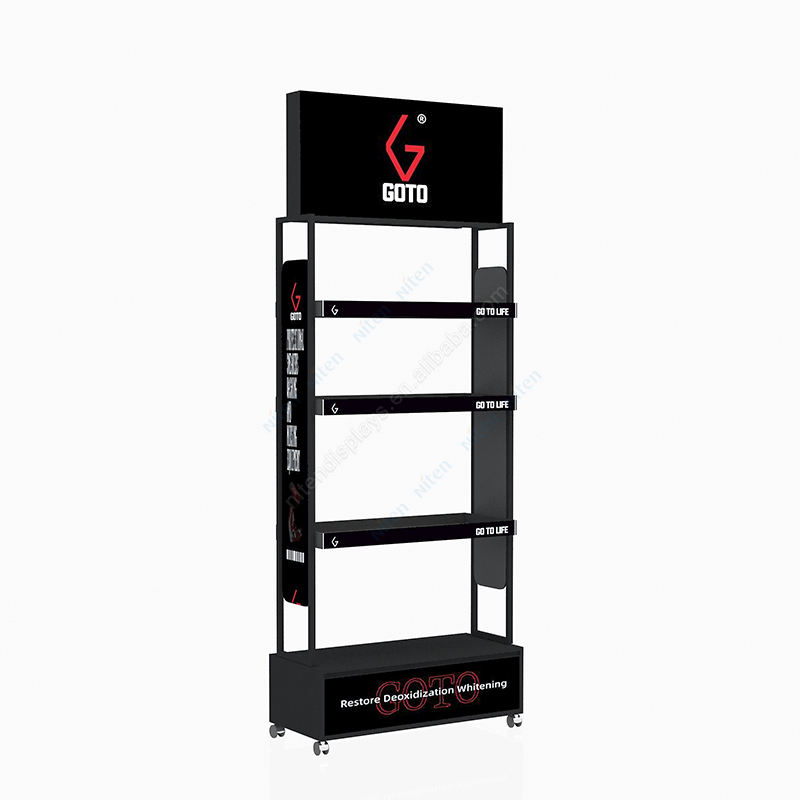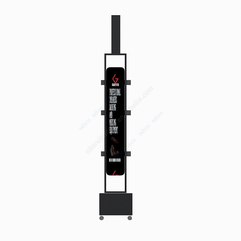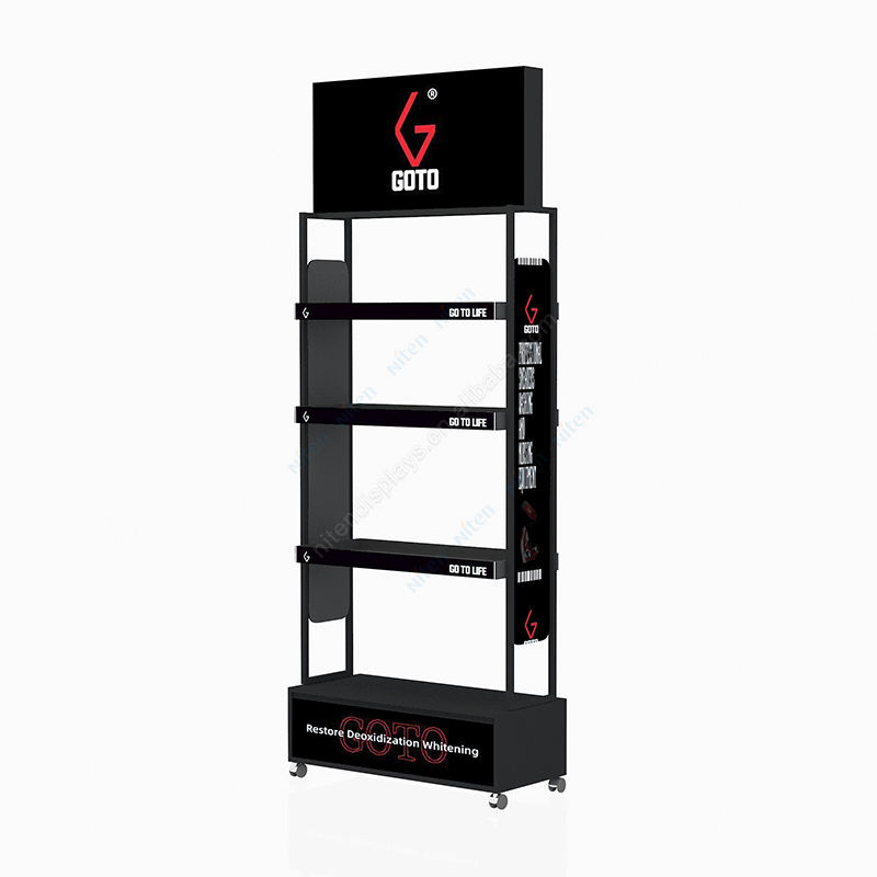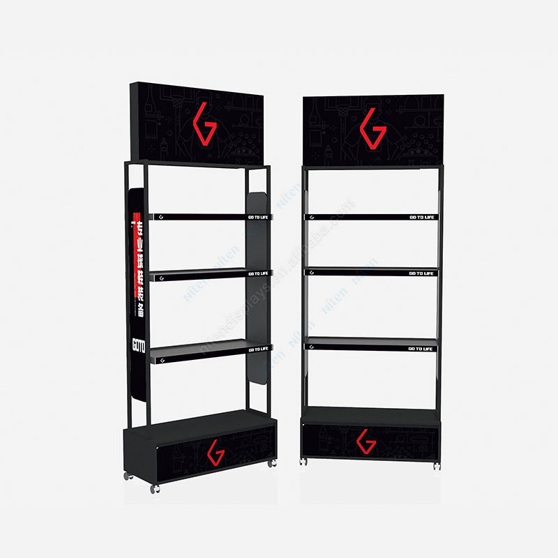 Présentoir au sol de promotion de collations réglables en métal noir mat avec crochets et étagères
