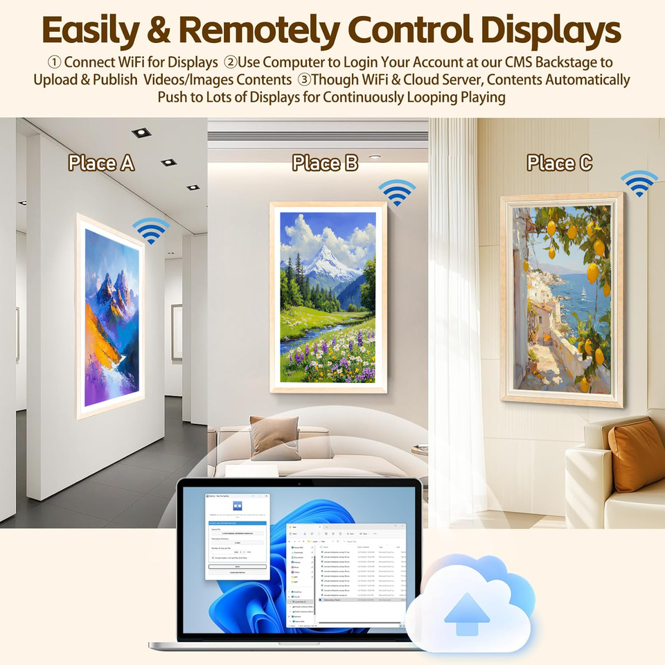 Cadre photo et vidéo numérique en bois massif mat anti-éblouissement avec écran 4K HD de 21.5 à 86 pouces Lecture vidéo Wi-Fi