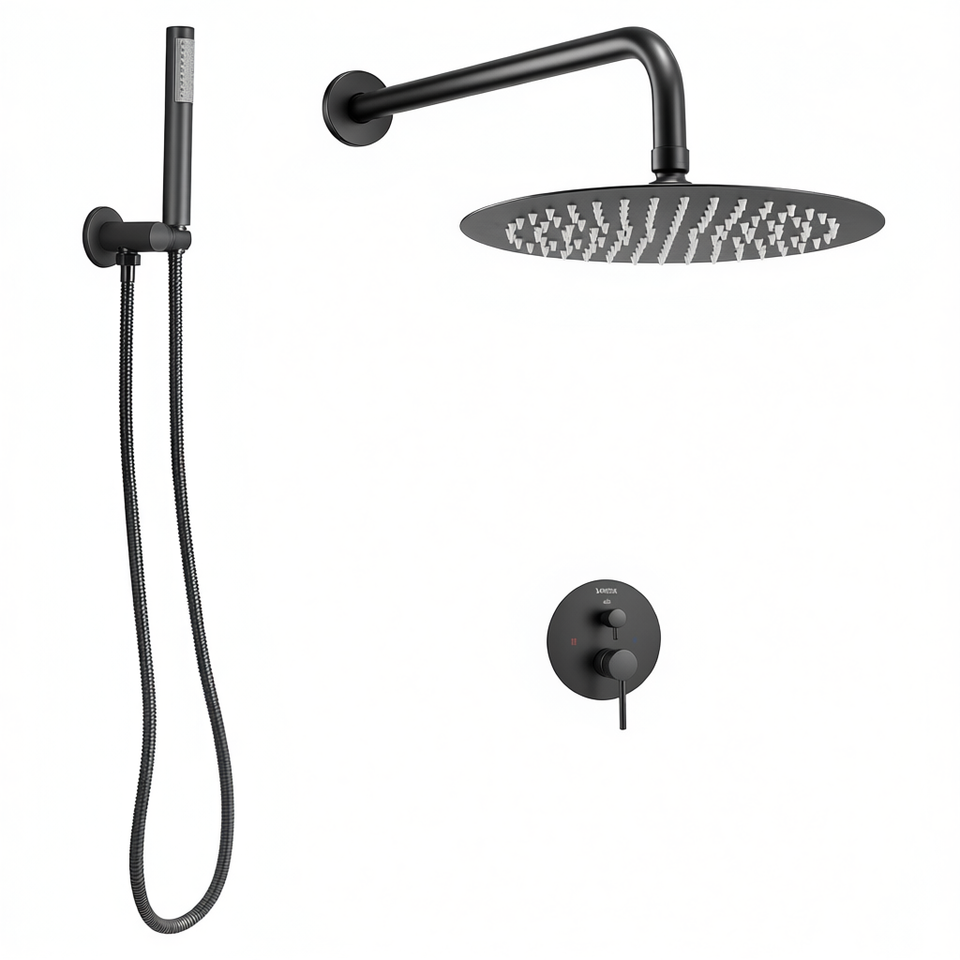 Ensemble de douche mural moderne noir mat 10 pouces avec pommeau pluie, système de pulvérisation à main et kit de garniture en laiton