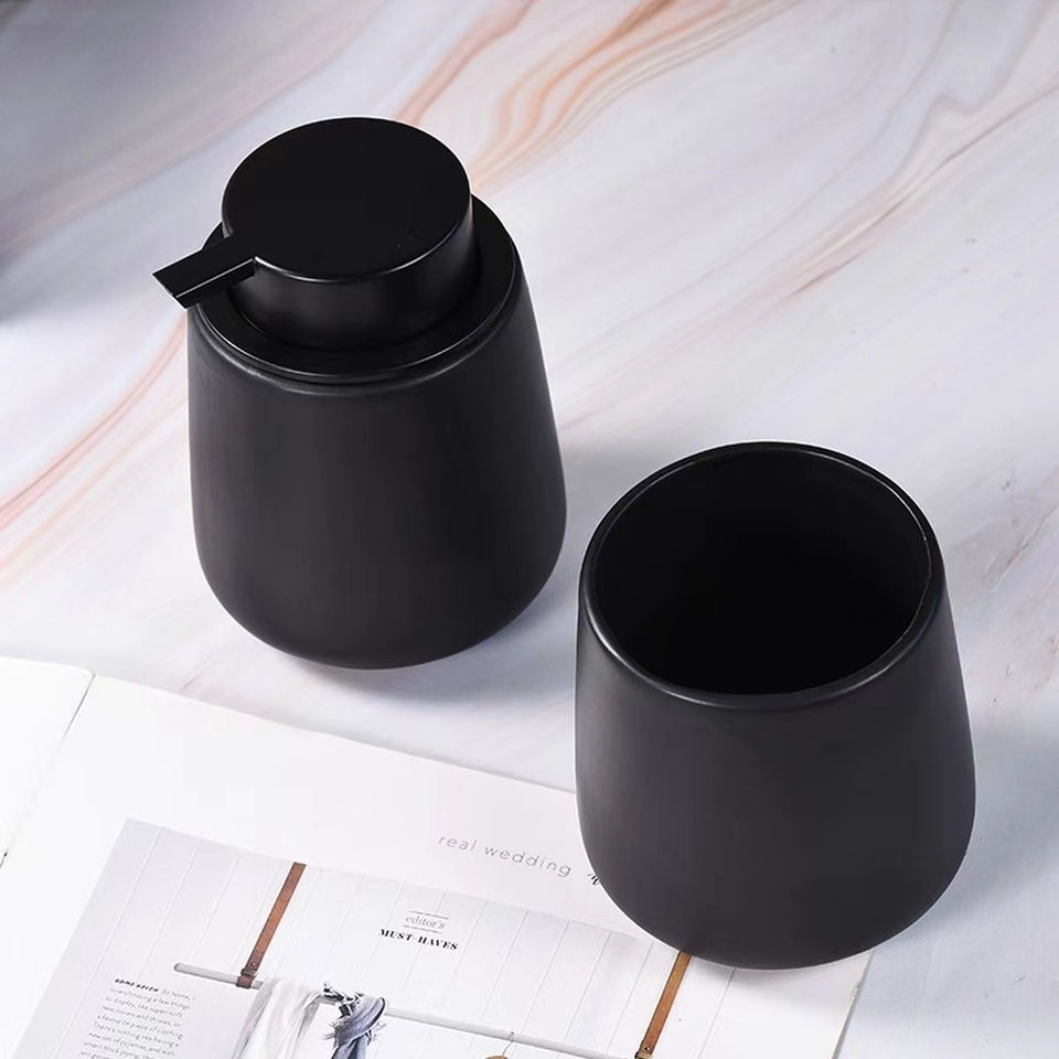 Ensemble deux pièces noir mat pour hôtels : Gobelet de bain et distributeur de savon double en céramique pour hôtels
