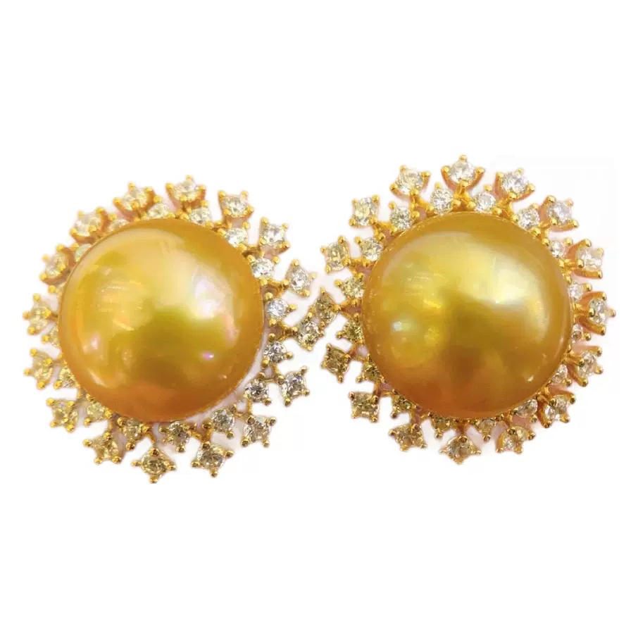 Matte Gold Luxury S925 Pure Silver 11-12mm Round Front Flawless Inlaid Natural Gold Coffee Colored Pearl Earrings
