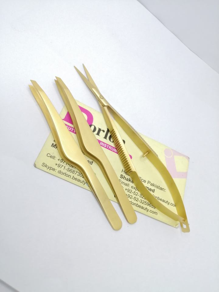 Pince à épiler biseautée dorée mate avec logo personnalisé, ciseaux à ressort aiguisés, vente en gros, ensemble de pinces à épiler et ciseaux cosmétiques pour sourcils