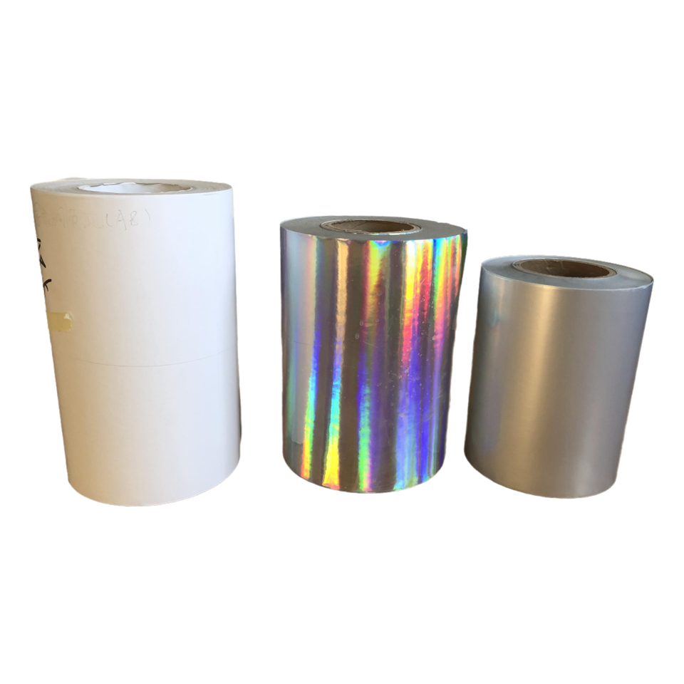 Rouleau d'étiquettes PET en argent métallisé mat polyester imperméable à transfert thermique code à barres étiquette résistante aux hautes températures