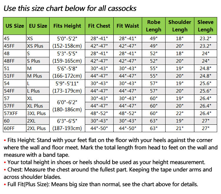 Emballage: une soutane de clergé est dans un sac en plastique et 12 ensembles sont dans un carton de 54*45*27cm.