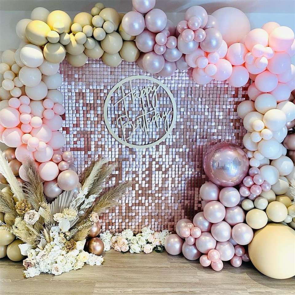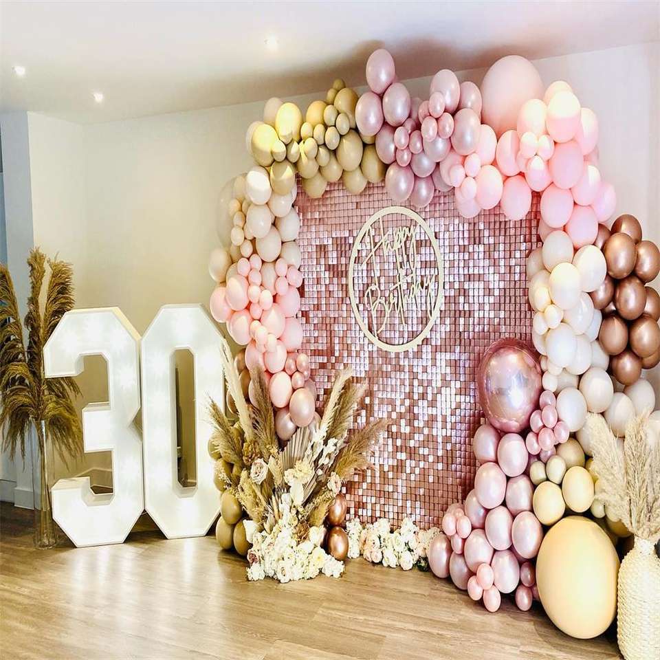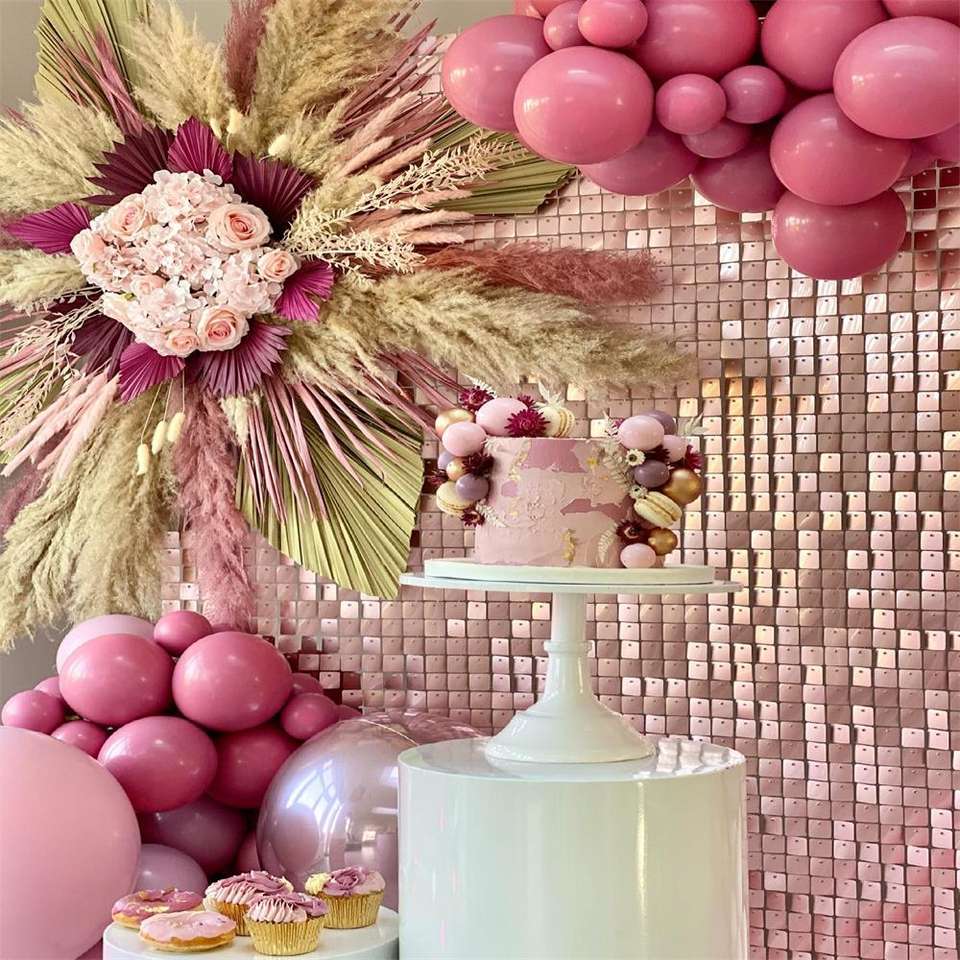 Mur scintillant à paillettes carrées de couleur or rose mat et flirty thème fête anniversaire gâteau magnifique décoration oh wow photomaton