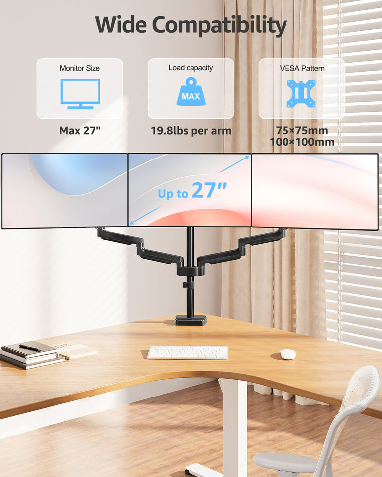 Support de bureau pour 3 moniteurs, bras triple pour ordinateur avec ressort à gaz, jusqu'à 27 pouces