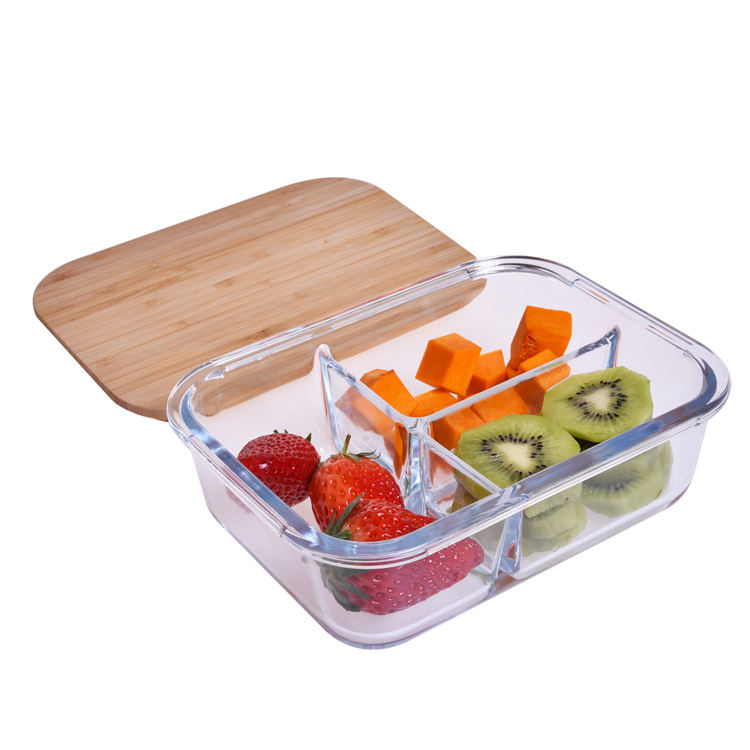 Boîte de conservation alimentaire en verre borosilicate avec couvercle en bambou et séparateur.