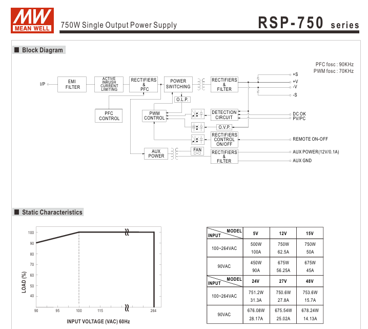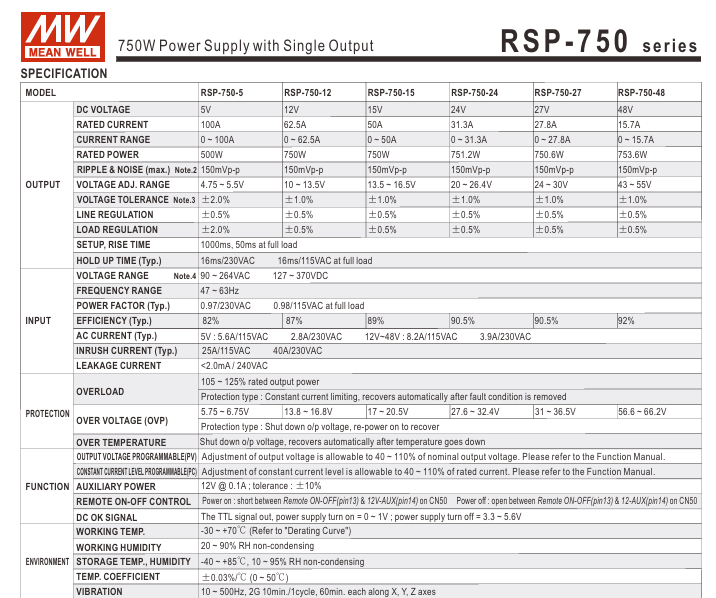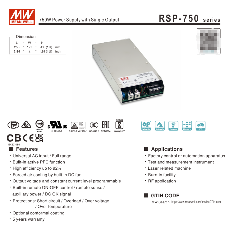 Alimentation à découpage à sortie unique Mean Well RSP-750-12 750W 12V 62.5A pour contrôle industriel