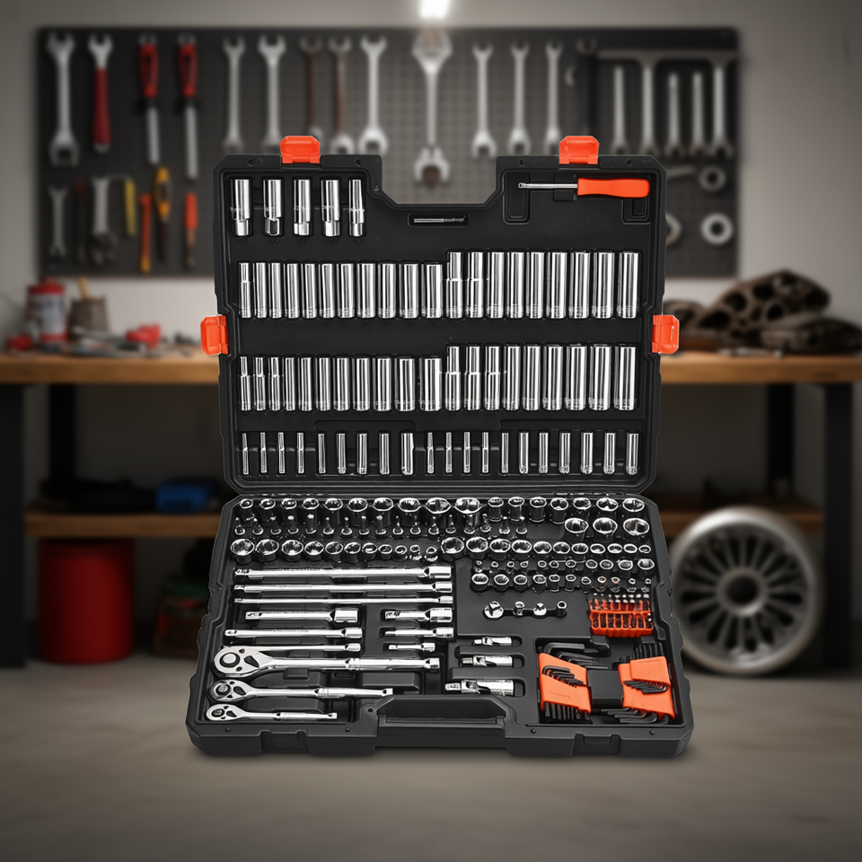Kit d'outils de mécanicien 225 pièces, jeu de douilles à cliquet 3/8 1/4 1/2 pouce, SAE et métrique, profondes et peu profondes, en acier allié chromé, avec rangement