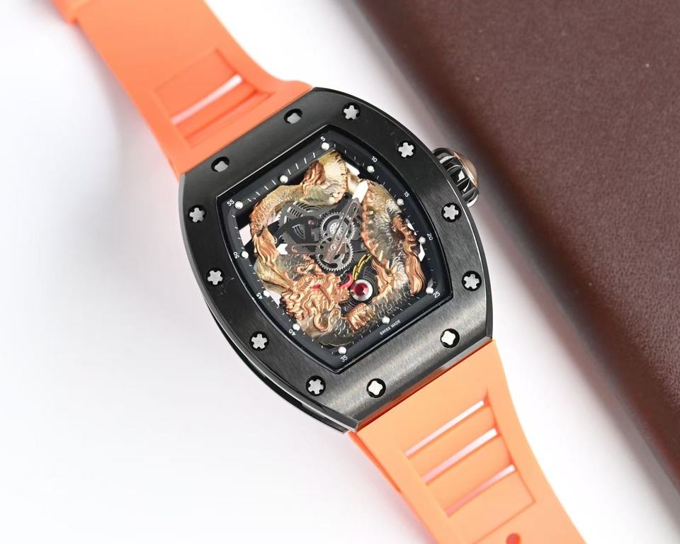 Montre mécanique avec mouvement automatique étanche, couleur orange, design sculpté dragon