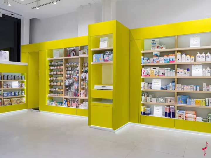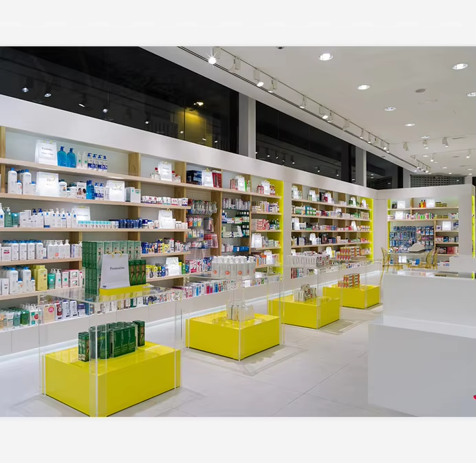 Aménagement intérieur de magasin médical : Vitrine et étagère de pharmacie en bois et verre trempé avec éclairage LED