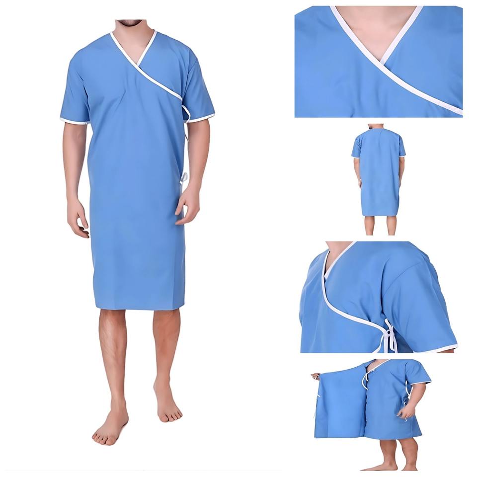 Robe de patient en coton mélangé, tissu denim, usage hospitalier, unisexe