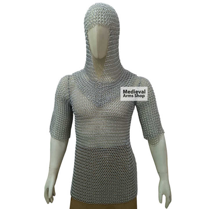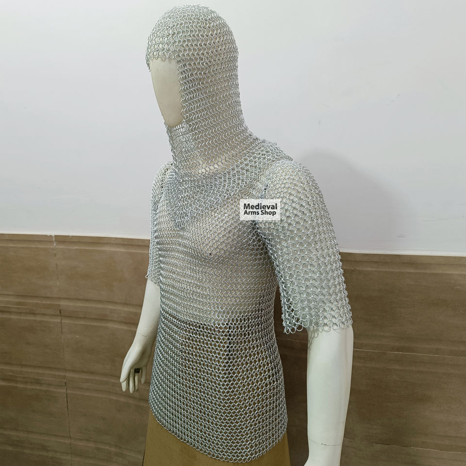 Haubert médiéval en aluminium fait main avec capuche intégrée, armure à anneaux boutonnés pour adulte, idéal pour reconstitution historique et fête d'Halloween