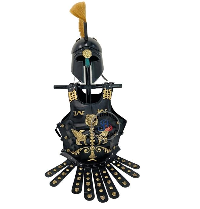 Casque Corinthien Médiéval Plume Naturelle avec Armure de Guerrier Muscle Veste en Cuir Costume d'Halloween Ensemble Noir Acier Calibre 18