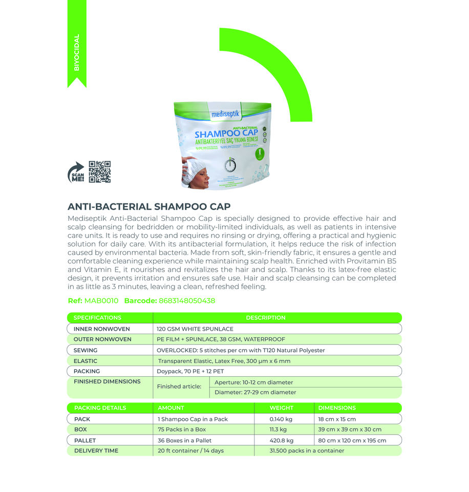 Chapeau de lavage antibactérien Mediseptik CHG sans rinçage pour personnes âgées alitées et usage post-chirurgical – Soin des cheveux abîmés et fins