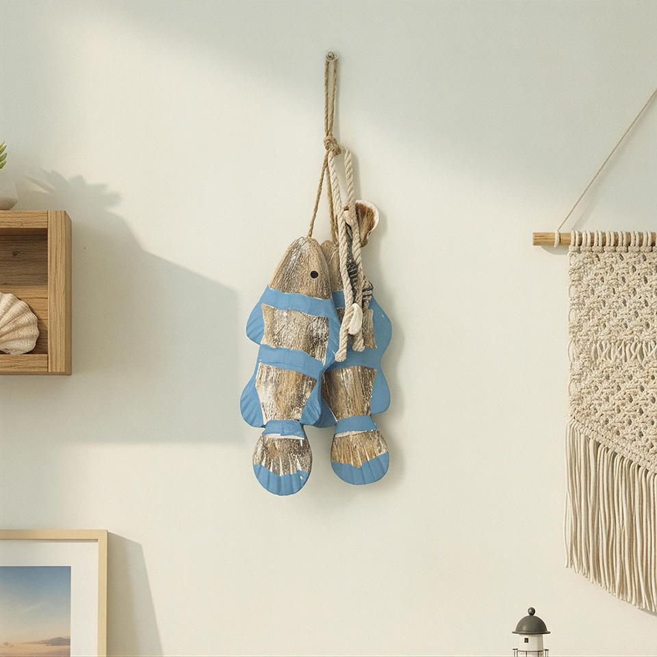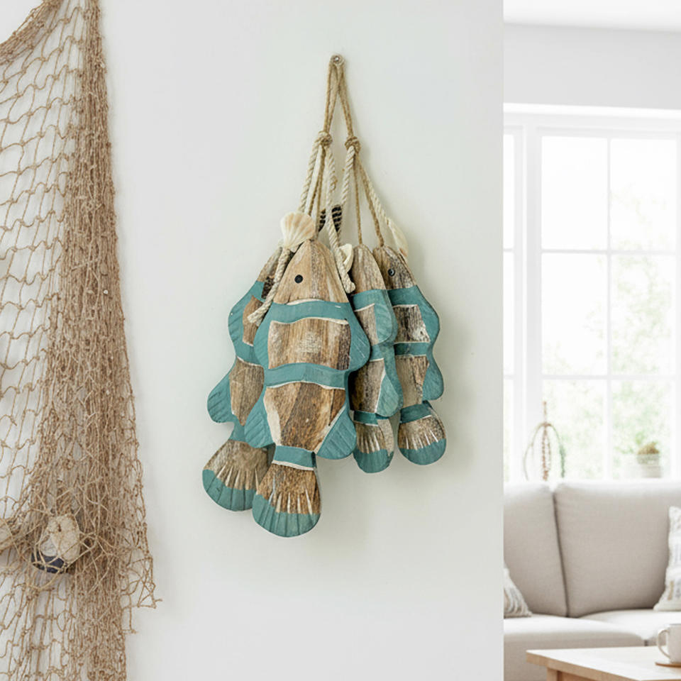 Mediterranean Style Wood Carved Fish String Wall Decor Hanging Ornament For Home Cafe Restaurant Living Room Decoration