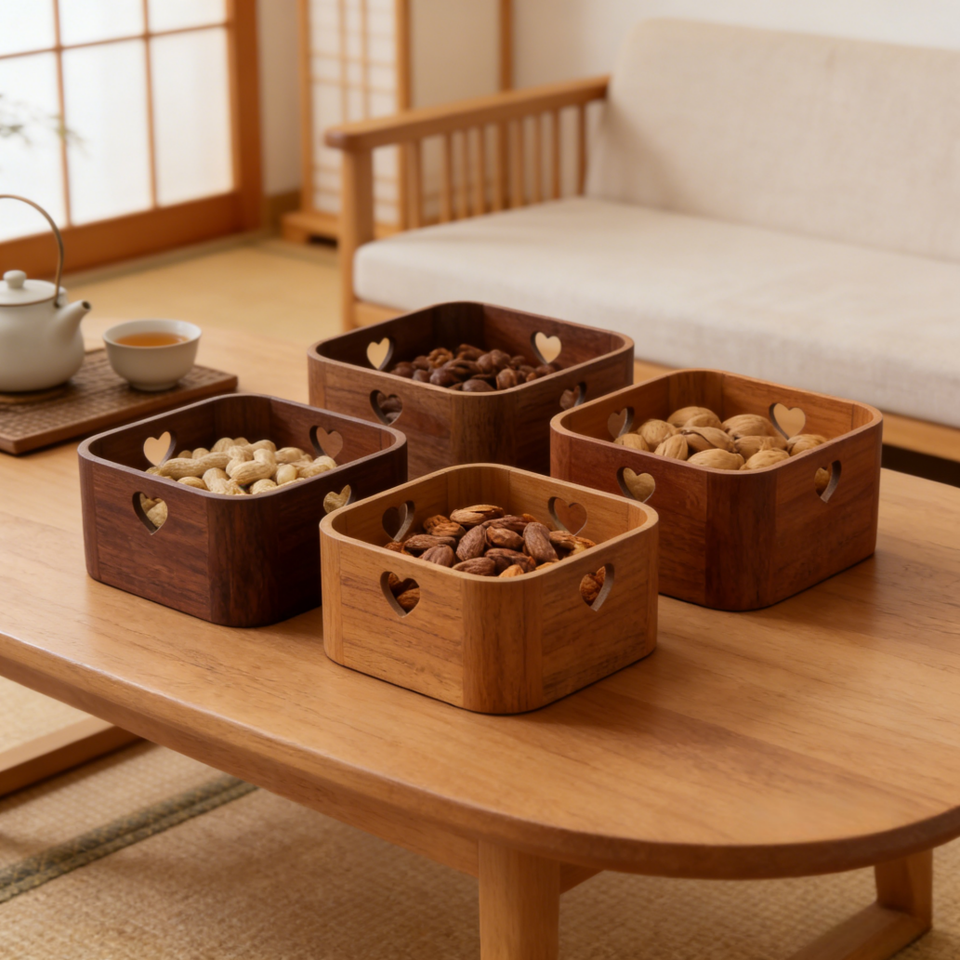 Panier de rangement carré en bois de couleur charretée de degré moyen avec poignées en forme de cœur. Style américain. Produit écologique.