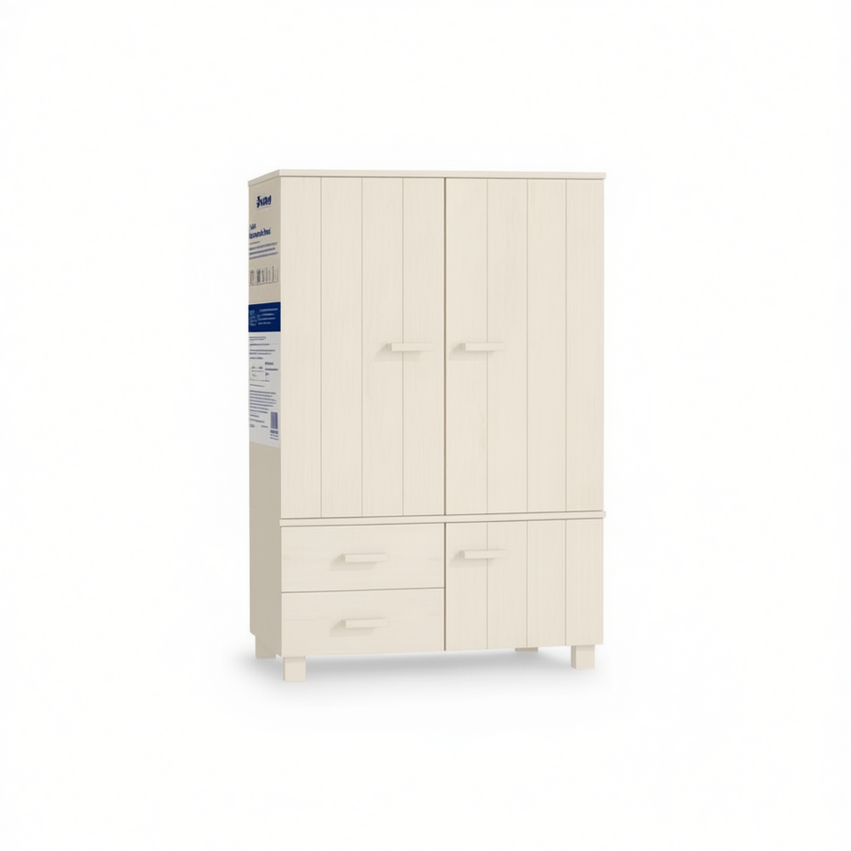 Armoire rectangulaire moyenne en pin massif brun avec portes battantes et 2 tiroirs, meuble de chambre autoportant