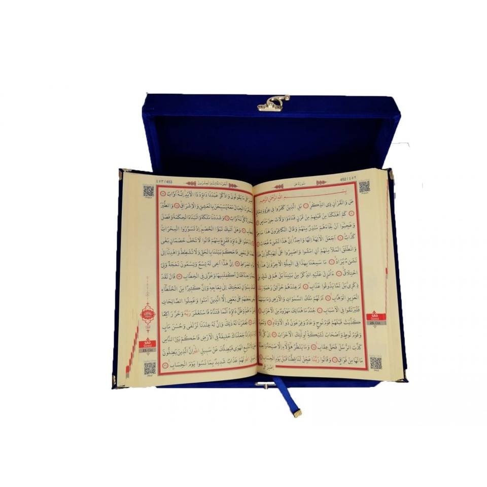 Coran de taille moyenne dans une boîte en bois avec texte ovale, 384 pages, sac en velours bleu marine - pour le rangement et l'exposition